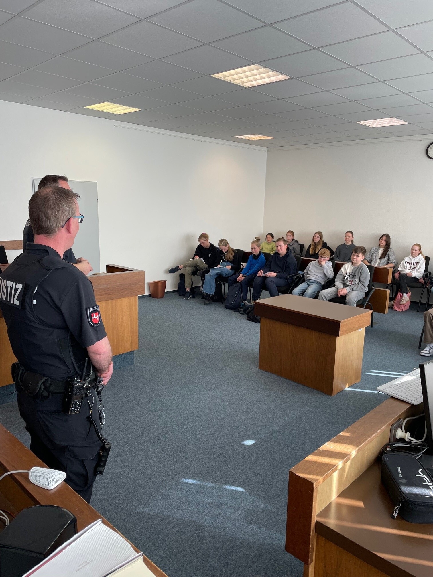 Los ging’s im Sitzungssaal, wo die Gruppe vom Direktor des Amtsgerichts Verden, Herrn Hauschildt, persönlich begrüßt wurde. Danach wurde es direkt ernst: Die Jugendlichen verfolgten als Zuschauerinnen und Zuschauer eine reale Strafverhandlung am Amtsgericht – ein echtes Highlight, bei dem viele zum ersten Mal erlebten, wie ein Gerichtsprozess wirklich abläuft.